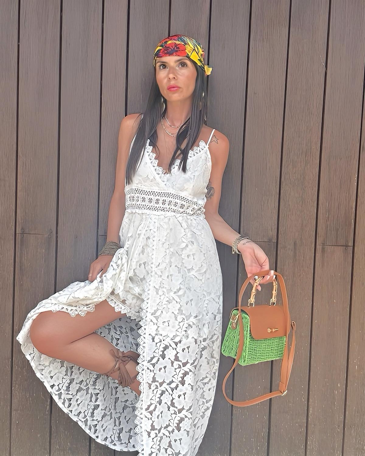Abito lungo in pizzo bianco con spalline sottili – romantico, leggero e perfetto per l’estate.